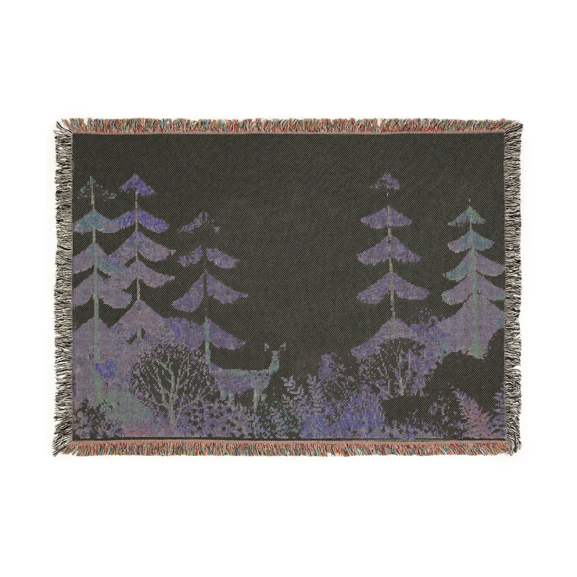 A cozy, handwoven cotton blanket that feels like a quiet walk through a forest at dusk. The woven threads give the design subtle texture and depth — soft pines and layered foliage rendered in muted pastels or deeper twilight tones. The colorful fringed edges add a tactile, rustic finish that invites you to drape it over a sofa, wrap around your shoulders on the porch, or layer at the foot of a bed. Choose the Photo variant to preserve delicate color transitions and soft gradients, or the Artwork variant to keep bold shapes crisp and defined. Comes in three sizes to suit a single-person snuggle or shared evenings with someone else. Note that mockups simplify the final weave; the real blanket has more nuanced thread detail and a warm, handmade feel.