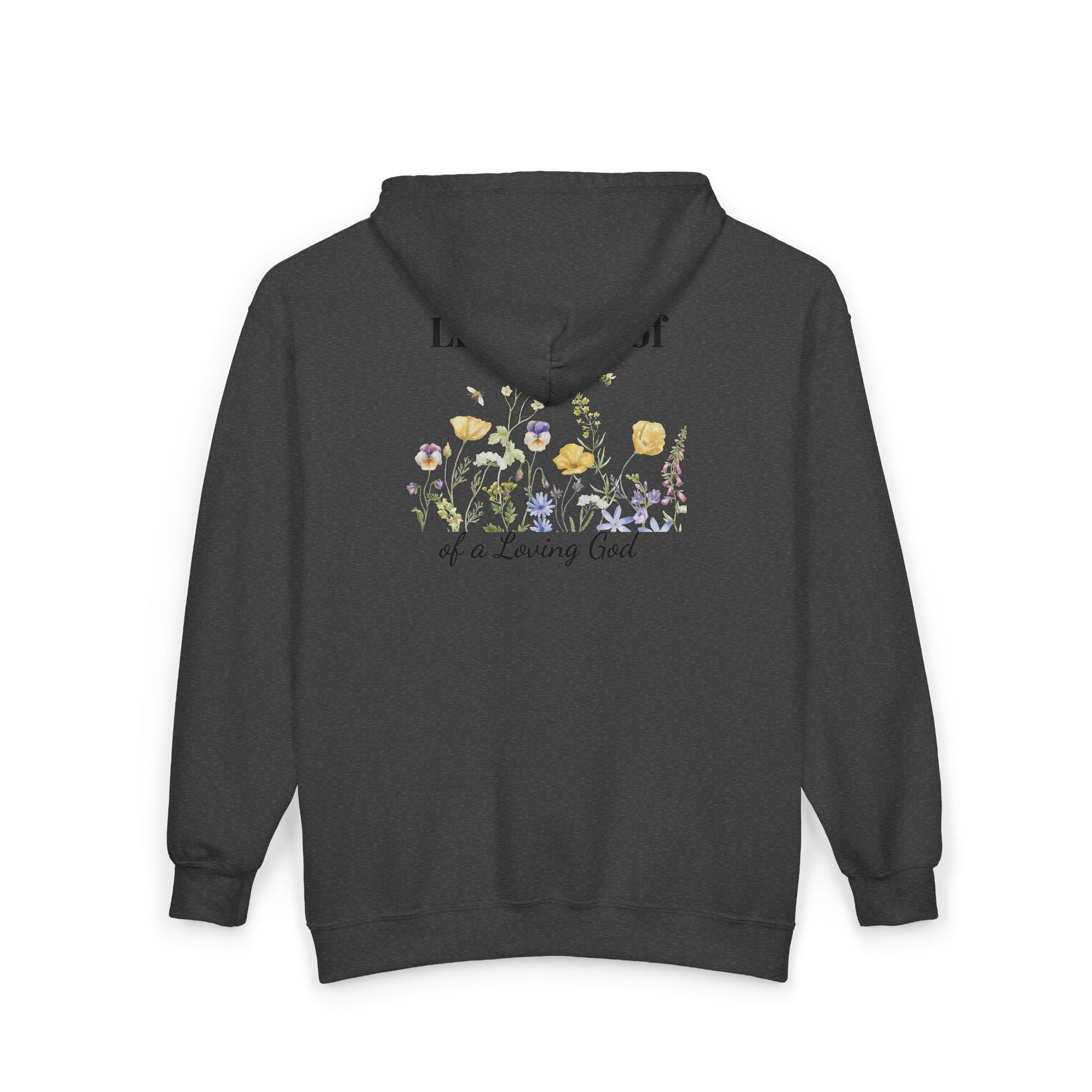 Grey full-zip hoodie embroidered with a soft, floral design and the words “Living Proof” across the upper back. The roomy hood and drawstring frame the neck for added warmth. Tubular-knit construction gives the fabric a smooth, seam-free look. Front pockets hold your phone and small essentials, while the medium-heavy 50/50 cotton-poly fabric keeps you cozy without feeling bulky. Subtle wrist prints and the option for left-chest embroidery add a personal, handcrafted touch. This classic-fit hoodie settles into everyday wear — comforting on slow mornings, steady at remembrance walks, or layered for quiet evenings by the garden.